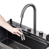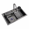 New Kitchen Hybrid Sink Combo - The Ultimate Upgrade for Your Kitchen! Experience unprecedented innovation with our Kitchen Hybrid Sink Combo. This extraordinary kitchen sink is a game changer that combines functionality and style. Our sinks are meticulously crafted with cutting-edge nano-coatings that not only offer stunning beauty but also unmatched durability and wear resistance. The built-in workstation sink offers unprecedented versatility, turning your kitchen into a culinary paradise. But what really sets this combination apart is its versatile spout with pull-out flexibility. Whether you need a gentle rain stream for delicate tasks or a powerful spray for tough cleaning, everything is at your fingertips. Plus, the sloped bottom. ensures easy drainage, keeping your workspace clean and efficient. Kit Includes: - 1x Stainless steel single bowl sink (75x46x22cm) - 1x Wooden chopping board (36x26x2cm) - 1x Stainless steel dishwashing basin (36x25x9cm) - 1x Stainless steel draining basket (36x26x10cm) - 1x Flying rain pull-out faucet (40x23cm - 1x Water Purifying Faucet - 1x Cupwasher - 1x Cup washer hose - 1x Downpipe (32cm) - 1x Flying rain pull-out faucet hot and cold water hose - 2x Angle valve - 1x Kitchen sink floor drain cover Features: - Filterability - Multi-angle water outlet - Three water dispensing modes - Durable and corrosion resistant - Sturdy and durable ,Easy to clean - Anti-overflow ,Heat resistant - Large capacity, Anti-stagnant water Specifications: - Color: Dark Grey - Material: Stainless Steel - Weight: 11.5 kg