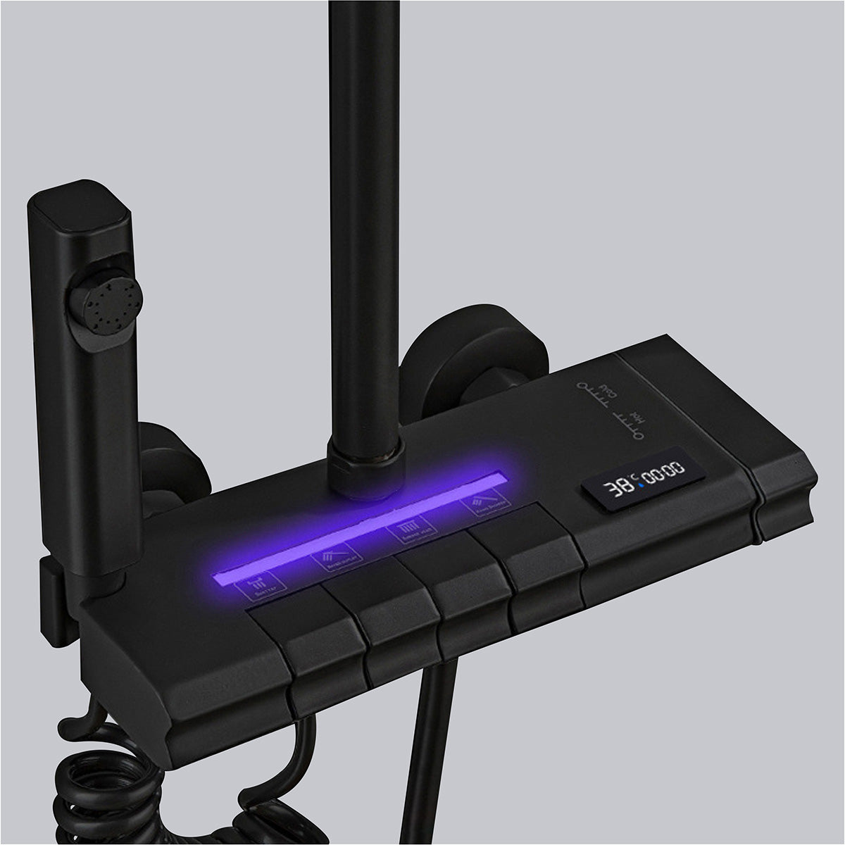 This modern exposed shower system in matte black adds luxury to your home. 1set Digital Display Black Shower Set With LED Ambient Light, Thermostatic Rainfall Shower System,Bathroom Shower, High-Pressure Handheld Spray Head, Bathroom Hardware, Bathroom Accessories, Enjoy A Luxurious Bathing Experience feature: Care instructions: Clean with a soft cloth and warm soapy water. Avoid chemicals and harsh cleaning methods such as scrubbers